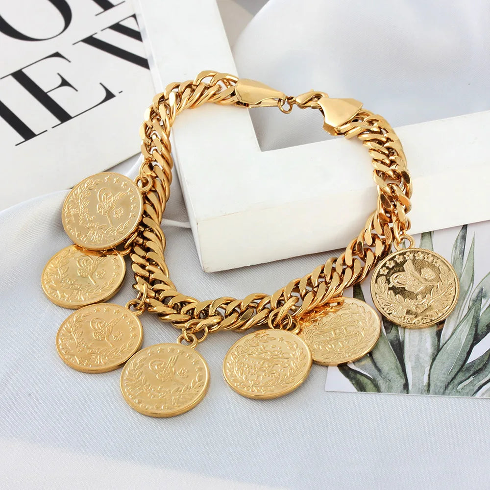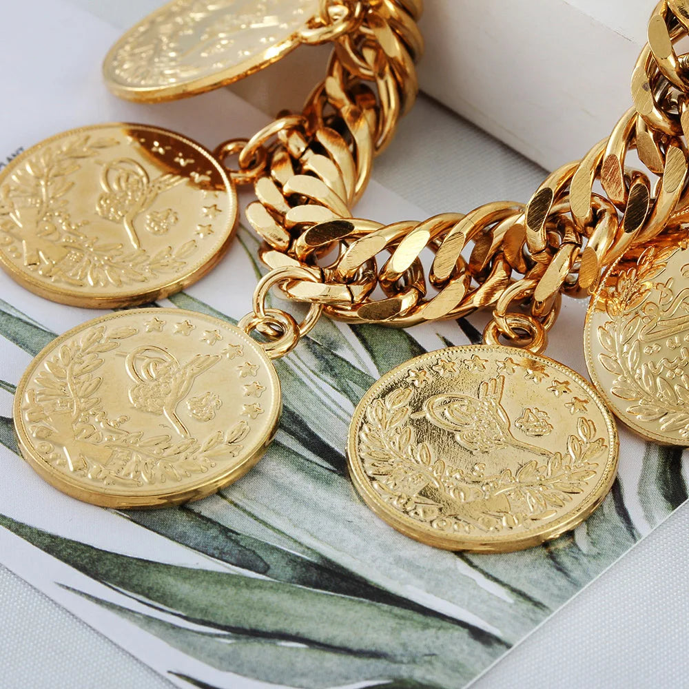 Add a touch of vintage elegance to your jewelry box with this gold coin bracelet that combines luxury and tradition.
