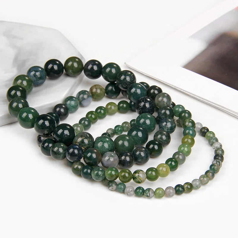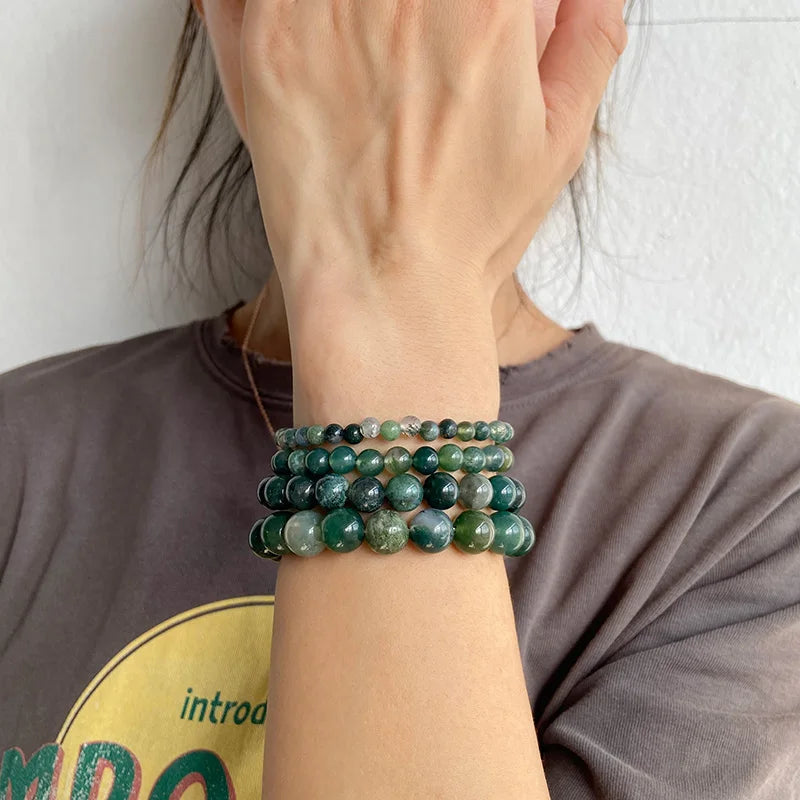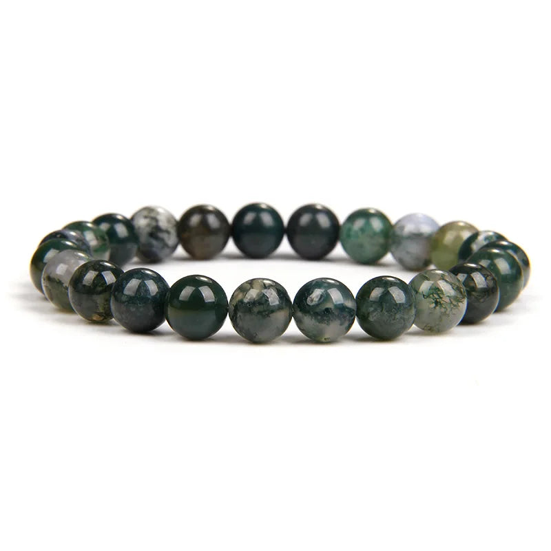 Our Moss Agate Bracelet features beautiful moss agate beads, believed to have grounding and calming properties. This bracelet is perfect for those who feel connected to nature and appreciate unique, earthy jewelry.